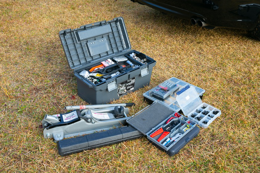 そしてもうひとつ、カメラ関連以外に必ず持っていくのが、油圧ジャッキやトルクレンチ、電装工具などクルマの工具一式。