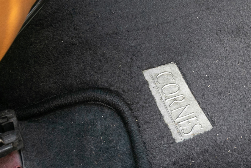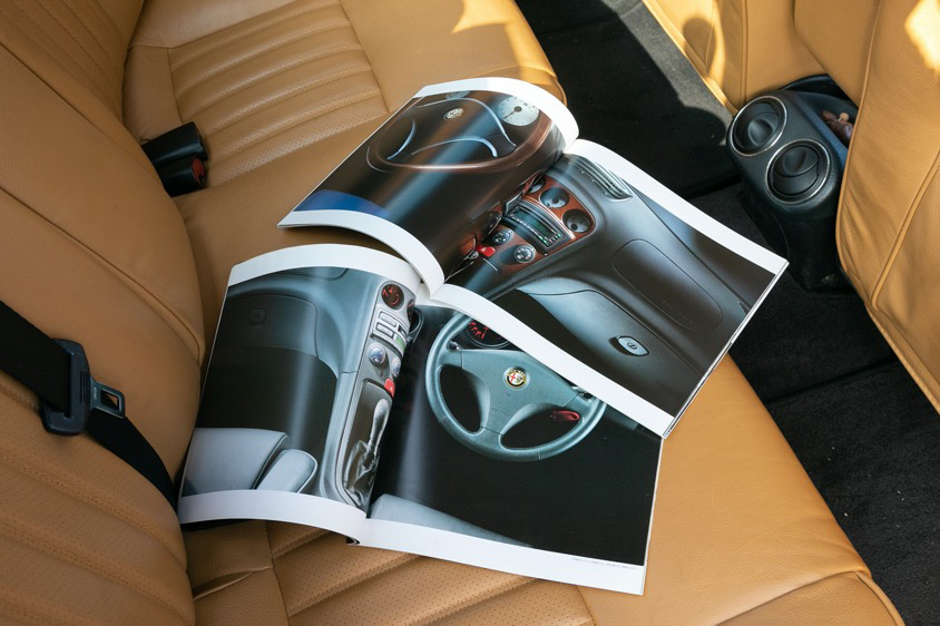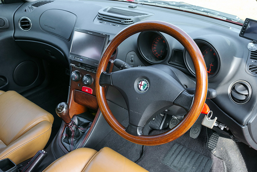 「最初に手を加えたのは内装でした。もともとは黒いファブリックだったんですけど、上級グレードのレザー仕様に憧れていたんです。たまたまアルファロメオディーラーの店長をしていた友達から、上級グレード内装の同じクルマが廃車になったという情報を得て、そのクルマから内張やシートを一式移植してもらいました。ほかにもセンターコンソールとウッドのステアリングは早い段階に見つけて交換しましたね。またフロアマットは高級車ディーラーの“コーンズ”がアルファロメオを扱っていた時期に作っていたオリジナルマットを購入しました。コーンズ物って当時の憧れで(笑)」