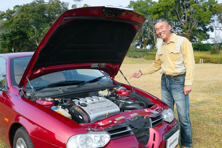 「若かった頃はこれで夜遊びに行ったりもしていましたが、今は嫁さんのNボックスと仕事用の軽トラがあるので日頃はほとんどそれに乗っています。“大きなイベントはアルファロメオで”というのを一家の決まりにしてるんですが、中一の娘には『Nボックスのほうがいい』って言われてしまうんですよ。確かにアルファはエアコンの効きも弱いし実用性では負けるので(苦笑)。でも興味がないのにこのクルマを所有し続けさせてくれる嫁さんには感謝ですね」