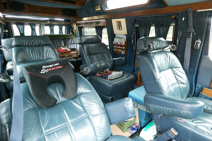またハイルーフボディで内装などがカスタムされたコンバージョンモデルということもあり、青を基調とした内張りやシートカバーで統一され、温かみのあるウッド素材の窓枠やドア周りパーツが映える車内は、手作り感と豪華さが感じられる広々としたリビングのような空間となっている。
