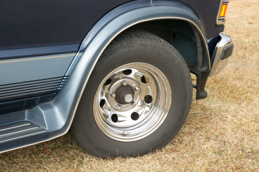 「ホイールは22インチのものとこの15インチのものが付いてきたんですけど、15インチの方を愛用していて、アメ車はケツ上がりのほうがかっこいいので後ろのタイヤの方が扁平の厚いものを使ってます。ちなみに後ろはトレーラーを引っ張るときに沈み込まないように純正でエアサスがついているんですよ」