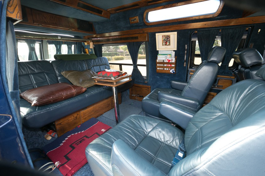「シートは対面にもできるしベットにもできます。ガレージでみんなでバーベキューをしたときは部屋にもどらずそのままこのラムバンで寝てしまうこともありますよ。なんとなく昭和のスナックって感じがいいですよね。それとこのクルマって7人乗りなんですけど、実際はほとんど奥さんとふたりでジェットスキーやキャンプに行くので、後ろに人を乗せることはあまりないんです(苦笑)。背面は観音開きで使い勝手がよくて、キャンプの荷物は基本ここから出し入れします」