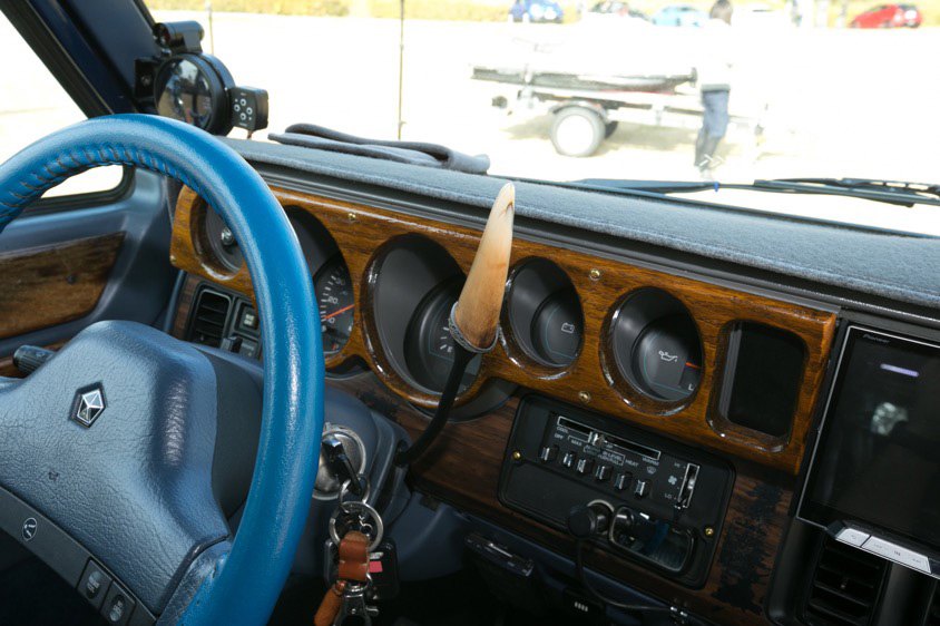 「車内では購入後に唯一いじっているのがコレ。象牙でできているシフトノブだけは僕が牙を削って加工したワンオフものです!」この象牙のシフトノブがあるだけで、もとのインテリアデザインと相まって運転席全体がワイルドな雰囲気になるのだから、その演出効果はバツグンだ。