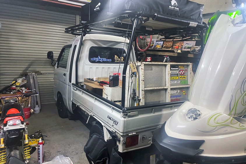 「乗らないときは常にガレージにいれているんですけど、鹿児島は梅雨が長いので365日エアコンをつけているんですよ。まあ、旧車を扱うならそれくらいは当然なのでなんとも思わないですけどね。ガレージの中には他にも3台のジェットスキーと軽トラを置いています。軽トラは近場に出かけるときに使ったり、ルーフテント仕様にしているのでキャンプするときにも使っているんですよ」