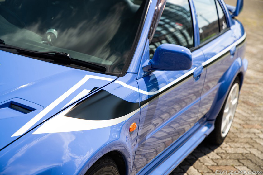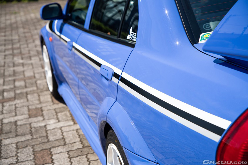 「最初は『えー、ソリッドの青?』って思っていたのに、今となっては光の当たり方でぜんぜん見え方が違うので面白いし、他にあまりないので気に入っています。オールペンのタイミングでは既にこのボディカラー以外は考えられないくらいになっていましたね。それから、フロントバンパーはこのクルマのあとに発売された『トミ・マキネン・エディション』のものを鈑金屋さんにお願いして苦労して取り付けてもらって、ボディサイドのスペシャルパッケージ限定ストライプも鈑金屋さんに『シール貼れる?』ってお願いしました(笑)。Bピラーも本来は黒なんですけど、トミマキ仕様と同じように同色で塗ってもらいましたね」