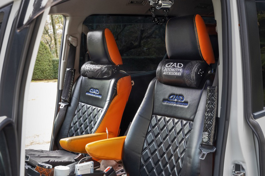そんな山下さんは「車内を華やかにカッコよく演出してくれる」とD.A.D.というブランドが大好きで、インテリアはシートカバーから小物に至るまでほぼD.A.D.アイテムで統一。ちなみにシートカバーはさまざまなカラーが選べる中から「住んでいるのがみかんが有名な愛媛だから(笑)」とオレンジ色をチョイスしたという。