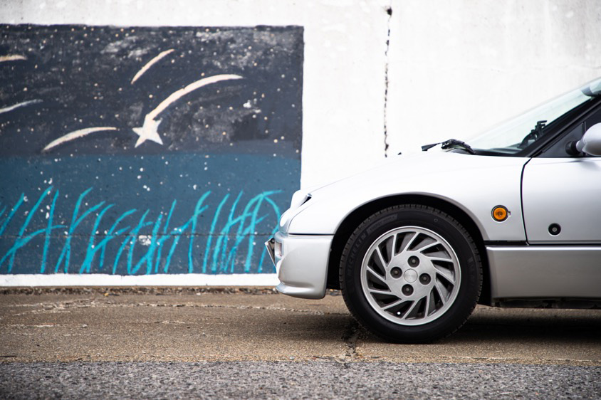 「フロントフェイスが特に好きなんですよ。ちょっとここに来て、真正面から見てみてください。まるで、目の離れたカバのようだと思いませんか? 両側にあるヘッドライトの間に黄色いフォグランプがあるでしょう。そのフォグランプの上が盛り上がっているから、まるで鼻の穴を膨らませているように見えるんです。サイドミラーは小さくて丸く、ボディカラーがM2-1015特別色のシルバーストーンメタリックだから、もうカバそのものだと思っています(笑)。その、間抜けなんだか何なんだかわからないデザインがすごく面白いんです。でも、走ると結構速くて、扱うのが大変なくらいピーキーな走りを魅せてくれるんです。その意外性もすごく良い」