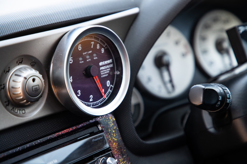 「購入してからカスタムしたのは、GTウイングとテールランプ、マフラー、ホイール、あとは灯火類。室内はステアリングにオーディオ、追加メーター類ですね」