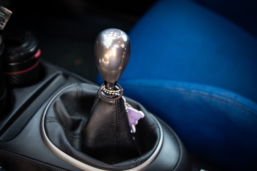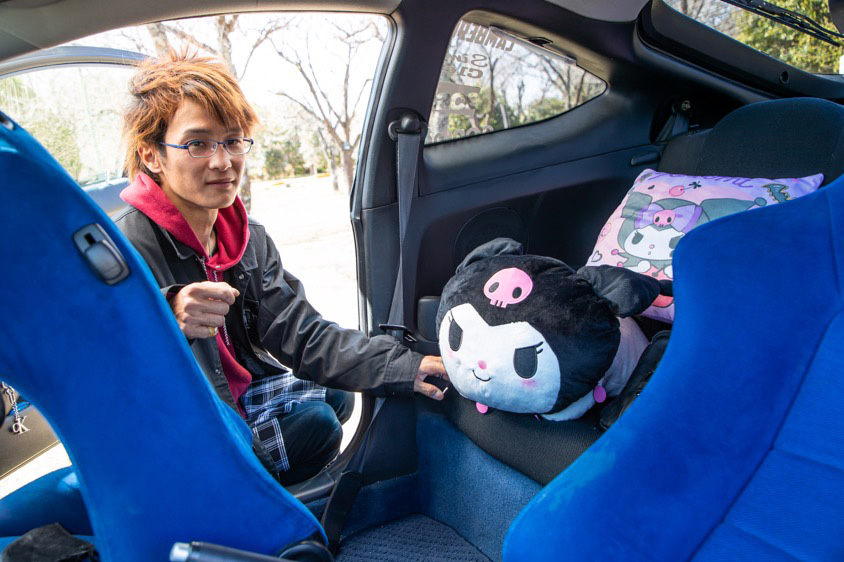 ドア内張りやカーペットまでブルーの生地が使用されたスポーティでクールな車内を見れば、高尾さんが青い内装にこだわったのも納得だ。しかし、それ以上にとても気になったのは、マイメロディのライバルキャラ、クロミちゃんのぬいぐるみやクッションが飾ってある後部座席。「UFOキャッチャーや一番クジでゲットしたんですけど、クロミちゃんのちょっと悪そうな雰囲気や色合いが好きなんです」とのこと。スポーティな車内で癒しの空間となっているこの一角に思わずギャップ萌えしてしまった。