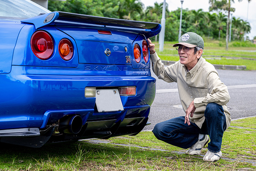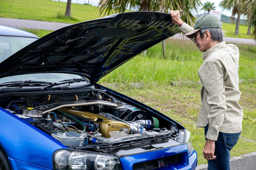 沖縄の海のようなベイサイドブルーの日産・BNR34型スカイラインGT-Rのオーナーさんは、910型ブルーバード、NAのS13型シルビア、ターボのS14型シルビアと、日産車をカスタムしながら乗り継いできた。BNR34型スカイラインGT-Rを譲っても良いと思う相手、そして最後のチューニングにとして考えていることとなどを伺った。