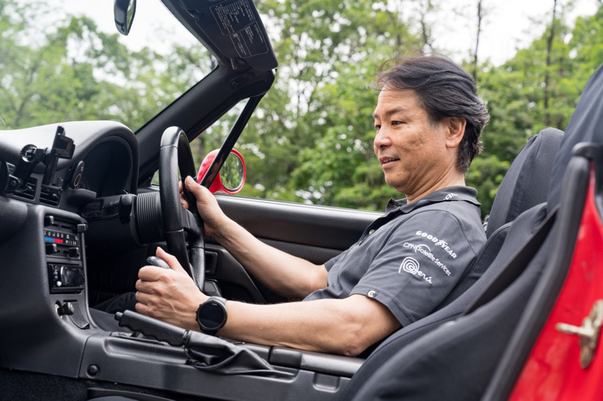 「多田さんいわく、クルマが曲がる時に軸となる“回転軸"が、できるだけクルマの中心に近くて運転席のヒップポイントの延長線上にあるのが理想的な設計で、曲がる時にクルマとドライバーの一体感が高くなるから、そこが大事なのだと。カプチーノはエンジンがフロントストラットよりも後方に搭載された『フロントミッドシップ』のFR車で、前輪タイヤと後輪タイヤの重量比は51対49とほぼド真ん中にあるんです。しかもこれ以上ないくらい着座位置が低くて低重心な設計です。だから操作していて本当に違和感がないんですよね」