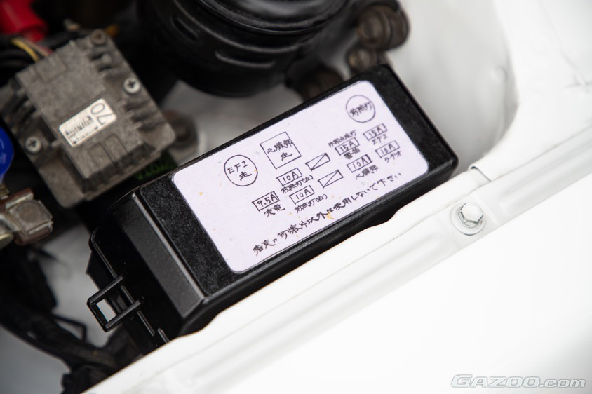 プリントが消えてしまったヒューズボックスの蓋には、同僚だった書道の先生に描いてもらったという配置図を貼り付けている。市販ステッカーも販売されているが、こちらの方が味わいがあってお気に入りのポイントになっているそうだ。