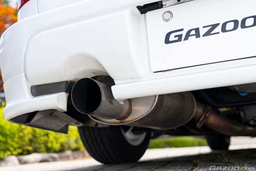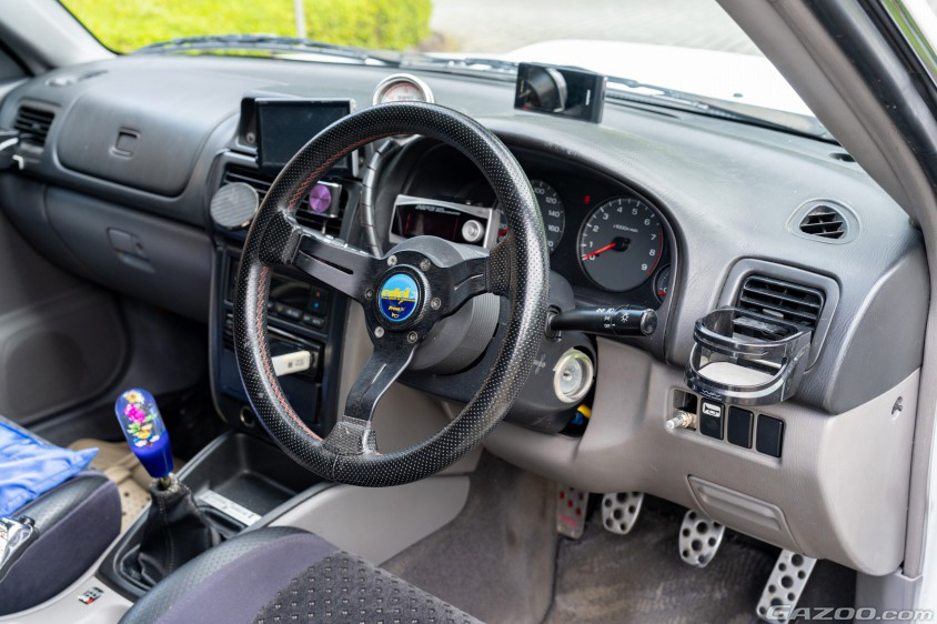 アルミホイールは往年のアドバンRCというモデルで「昔、雑誌で見かけたGC8型インプレッサがすごくカッコよくて、そのクルマが白のアドバンRCを履いていたんです。そのイメージに近づきたくて選びました」とのことだ。