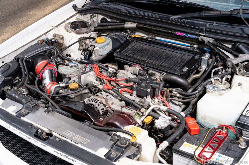 アルミホイールは往年のアドバンRCというモデルで「昔、雑誌で見かけたGC8型インプレッサがすごくカッコよくて、そのクルマが白のアドバンRCを履いていたんです。そのイメージに近づきたくて選びました」とのことだ。