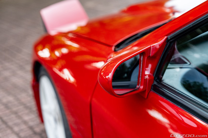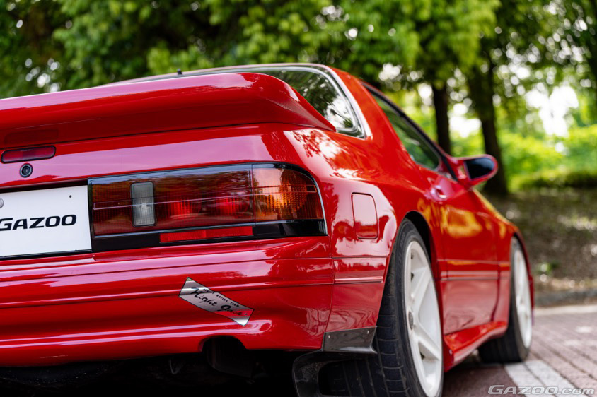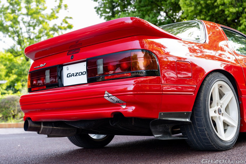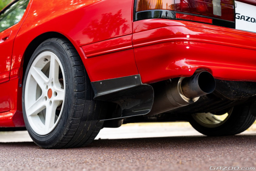 「納車時にRE雨宮のリヤスポイラーをつけてもらいました。マフラーは車検対応のJICマジック製を装着しています。そして真っ白なスピードラインのホイールもお気に入りです。塗装に関しては、私が所有してきた9年間は洗車時に撥水スプレーをかける程度で、とくに何もしていないんですよ。元々は関西の鈑金屋さんのデモカーだったらしくて、恐らく20年近く前だと思いますが、純正と同じ色でオールペンしているそうです。長い間青空駐車だったのに色褪せずにこれだけキレイってことは、それだけ上質で強い塗装だったんでしょうね」