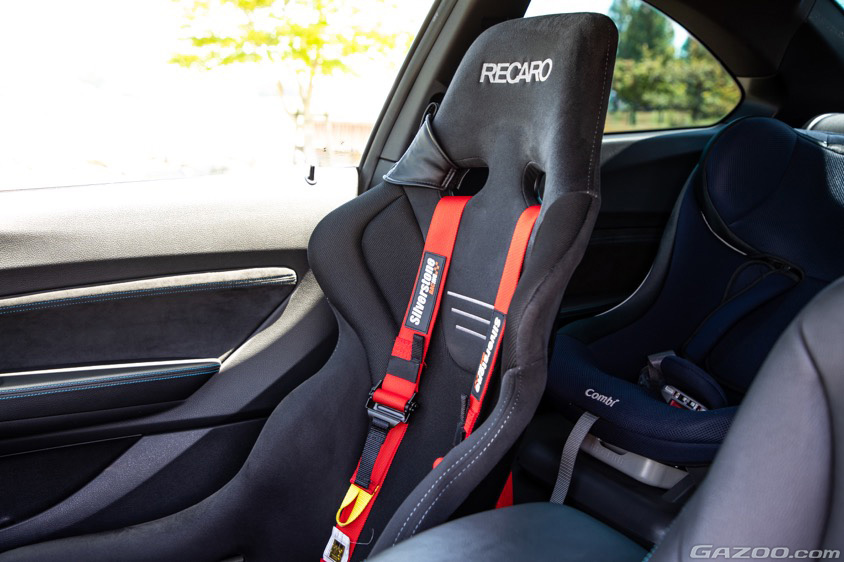 サーキット走行を想定して運転席にはレカロのバケットシートと6点式ハーネスをセット。その後ろには娘さんの指定席であるチャイルドシートを装着。運転席に合わせたレカロのチャイルドシートも考えていたというが、自身が考える使い勝手や安全性を重視してコンビをチョイス。もう少し大きくなってジュニアシートに変更する時は、運転席同様のレカロ製を組み合わせたいと考えている。