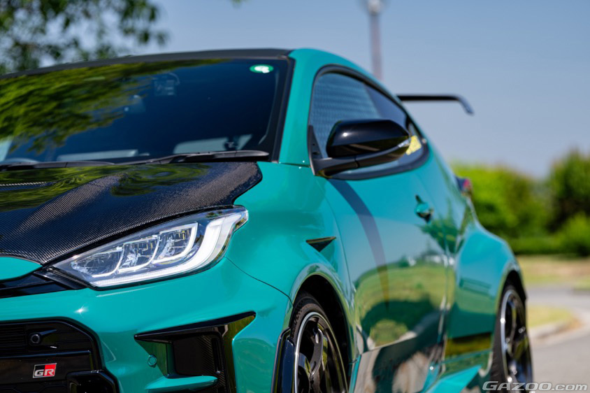 「フレームまで歪んでしまった事故は、ディーラーからは廃車にして買い換えを進められる程でした。そこで大切なGRヤリス仲間の72ファクトリーさんに相談して、修理とカスタムを兼ねて復活させてもらうことにしたんです。その際、フロントフェンダーとボンネット、リヤのテールゲートを72ファクトリーのオリジナル製に。車高調をアペックス製に交換してもらいました」