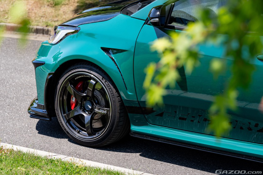 「フレームまで歪んでしまった事故は、ディーラーからは廃車にして買い換えを進められる程でした。そこで大切なGRヤリス仲間の72ファクトリーさんに相談して、修理とカスタムを兼ねて復活させてもらうことにしたんです。その際、フロントフェンダーとボンネット、リヤのテールゲートを72ファクトリーのオリジナル製に。車高調をアペックス製に交換してもらいました」