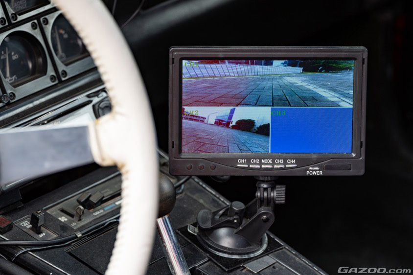 ロングノーズ/ショートデッキのスタイリングは、デザイン的には魅力的ではあるものの、運転するとなるとデメリットも大きい。特にフロントの見切りが悪く、見通しの悪い路地などから合流する場合は左右の状況が判断できないこともある。そのためフロントは左右方向に向けてカメラをセット。コンソールに取り付けたモニターに映し出すことで、安全にドライブできるよう工夫が施されているのだ。もちろんバックカメラも搭載しているため、全方向フルカバーの安心感が得られるのは現代的なアップデート術と言えるだろう。