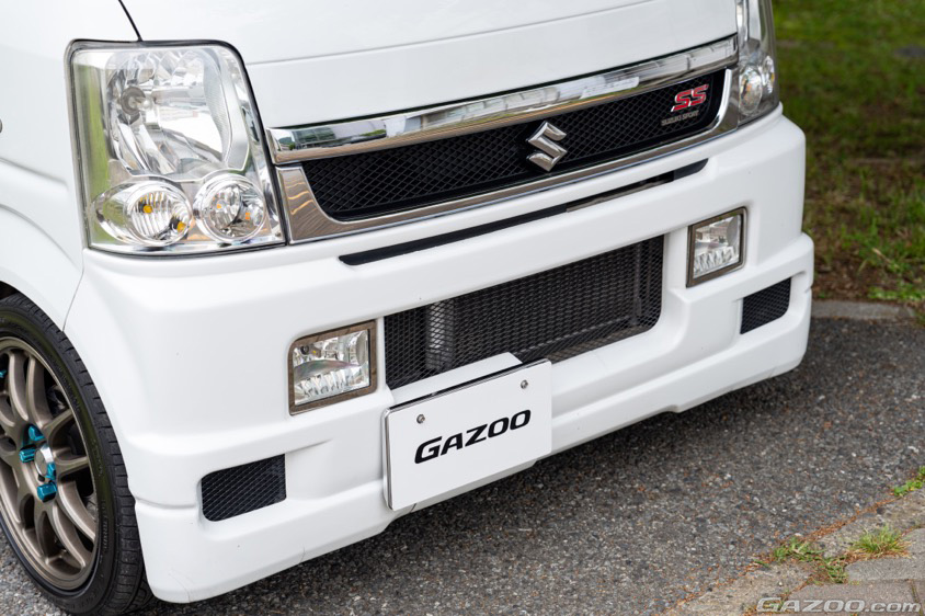 そのため、素の状態では物寂しかったバン本来のスタイリングは、ワゴン用の部品を使用することでリファイン。中でもフロントバンパーはスズキスポーツ製に変更し、開口部にはダミーインタークーラーをセット。“質実剛健な仕事グルマ”というイメージを払拭するコーディネイトで、バンの印象からの脱却を図っているのだ。