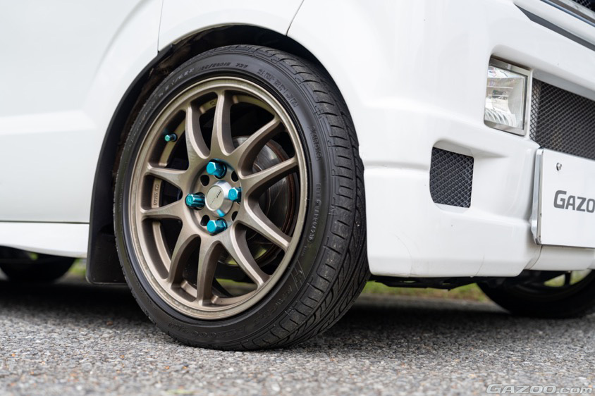 フロントブレーキは、ノーマルだと12インチのソリッドローターだが、それを13インチのベンチレーテッドローターに交換してバージョンアップ。ワゴン用パーツを流用できるので、手軽に機能強化を図れるのもエブリイバンの魅力だ。