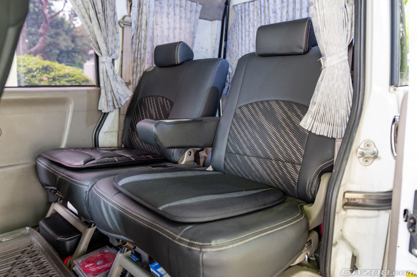 リヤシートはエブリイJOINから流用し、後部座席の居住性もアップ。同時にシートカバーを利用することで質感も高められている。とは言っても、趣味のドライブだけでなく仕事でもタイヤを積み込んだりとフル活用しているため、過剰なカスタマイズではなく使い勝手を向上するアレンジに留められているのは(株)ヤスさん流のこだわりだ。