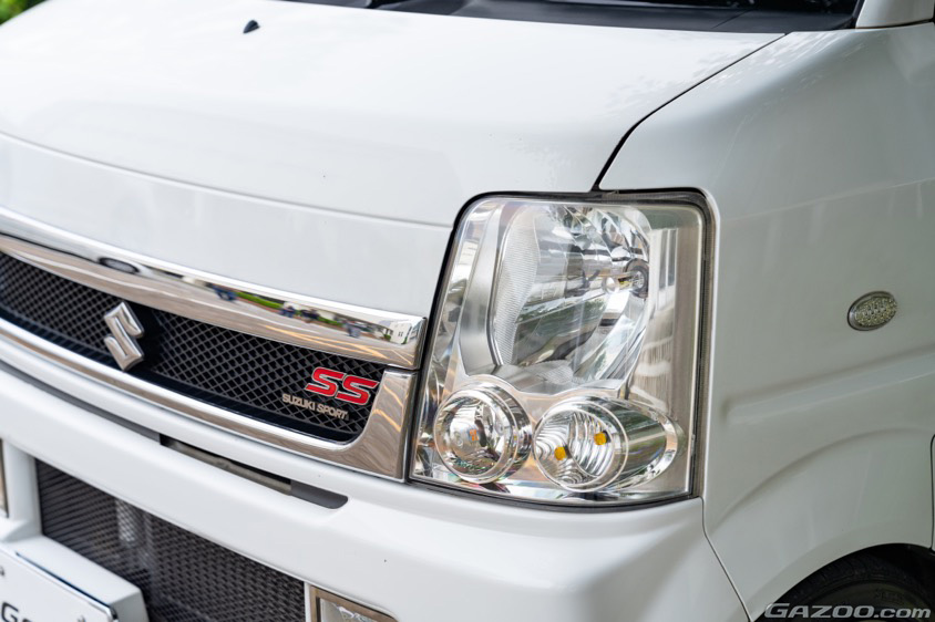 本来のヘッドライトは飾り気のないシンプルなデザインだったものの、よりデザイン性をもたせたワゴン用に変更。エブリイ用ヘッドライトは社外品も豊富に用意されているが、やはり純正の品質と機能性を重視した結果、ワゴン用を装着している。また、バンパー交換に合わせてメッキグリルを装着しつつ、ラパンSSから拝借したエンブレムをワンポイントとして装着するなど、細かいアレンジも楽しんでいる。