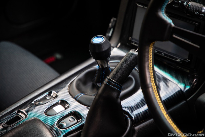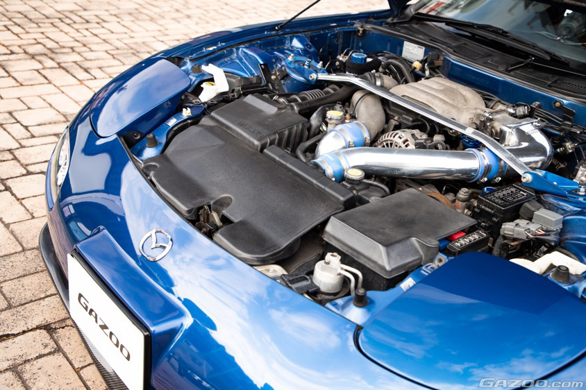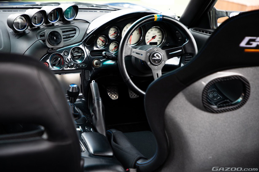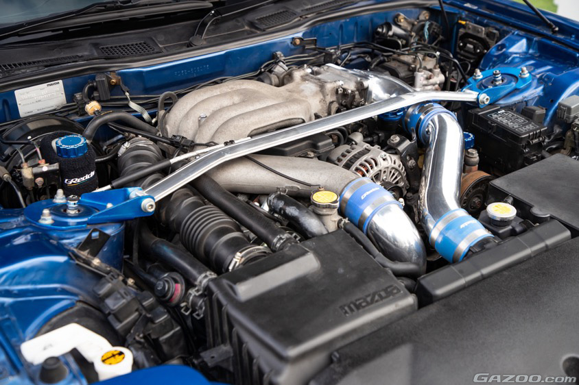 280馬力というハイパワーを誇る最終型の13B-REWロータリーエンジンの性能に関してはそのままで十分満足と感じたことから、購入後にはウェッズスポーツのアルミホイールや藤田エンジニアリングのサイドステップ、フジツボの車検対応マフラー、ブリッドのフルバケットシートなど、内外装に自分流のモディファイを加えていくいっぽうで、エンジン本体はノーマルをキープしたという。