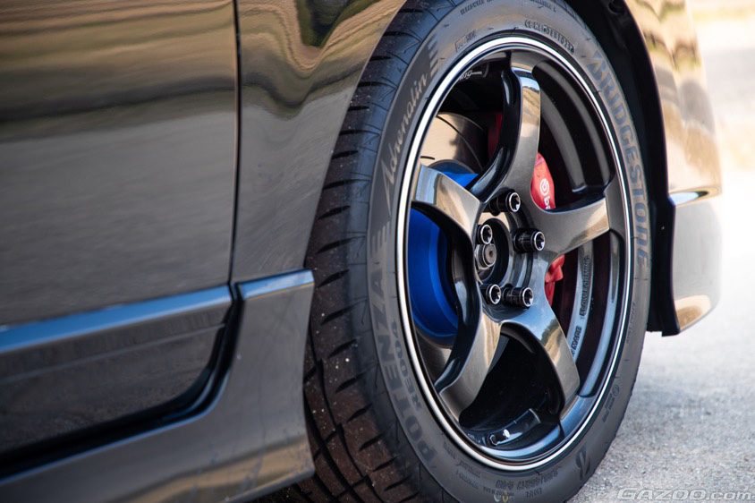 サスペンションはHKSのハイパーマックスSへと変更。車高調整式ではあるが、ローダウンは控え目な範囲に留められている。その他、購入時に擦り傷が目立っていた純正アルミホイールは17インチサイズのアドバンレーシングへと履き替えた。ブラックのボディカラーにブラックのホイールという組み合わせはなかなかの迫力だ。