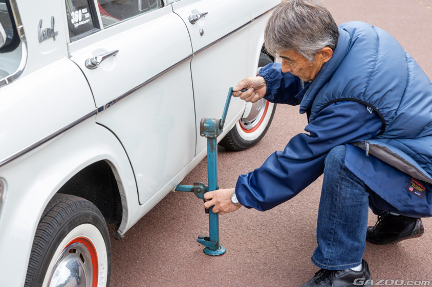 と、まず説明してくれたのが赤い旗。停止表示板の役割を担い、サイドウィンドウに引っ掛けて使用するというもの。そして、エンジンルーム左端には純正ジャッキが搭載されていて、写真のようにボディサイドに設けられたジャッキ専用のホールに差し込み、レバーを回転させて車体を上げるという仕組みだ。
