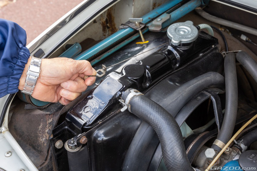 エンジンルームのサイドにはラジエターが配置されている。エンジン駆動の冷却ファンによってフレッシュエアを引き込んで冷やすという仕組みは通常と同じだが、側面から引き込むという配置はちょっと珍しい。そして、オーナーが引っ張っているワイヤーは、その風量を調整するべく、ラジエター面をシェードしているロールカーテンを開閉するもの。全閉から2段階の開閉調整ができ、冬場は全閉にしてラジエターへの冷気を遮断。これによって水温が短時間で上がり、エンジンが早く暖まるとともに、ヒーターの稼働効率も高まるという。
