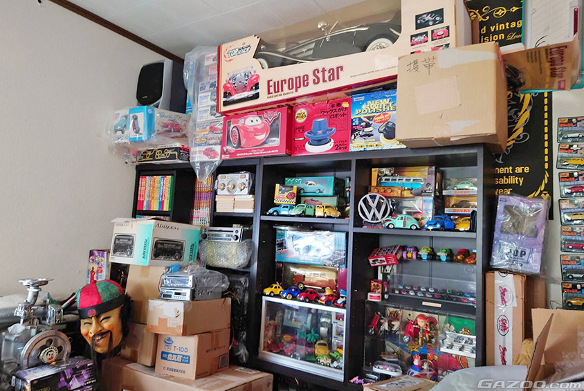 そして、その願望はクルマを所有するだけでは飽き足らず、カーパーツやその関連アイテムも多数コレクションしているとのこと。S600や初めての愛車だったN360をはじめ、過去に乗っていたフォルクスワーゲン・ビートルやタイプII(ワーゲンバス)など、20畳ほどの自宅倉庫にはそれらのグッズが溢れかえっている。
