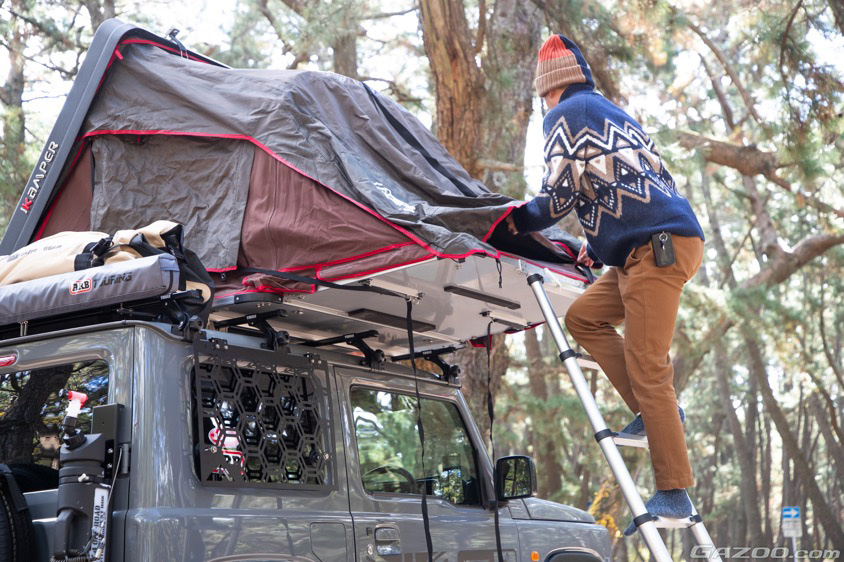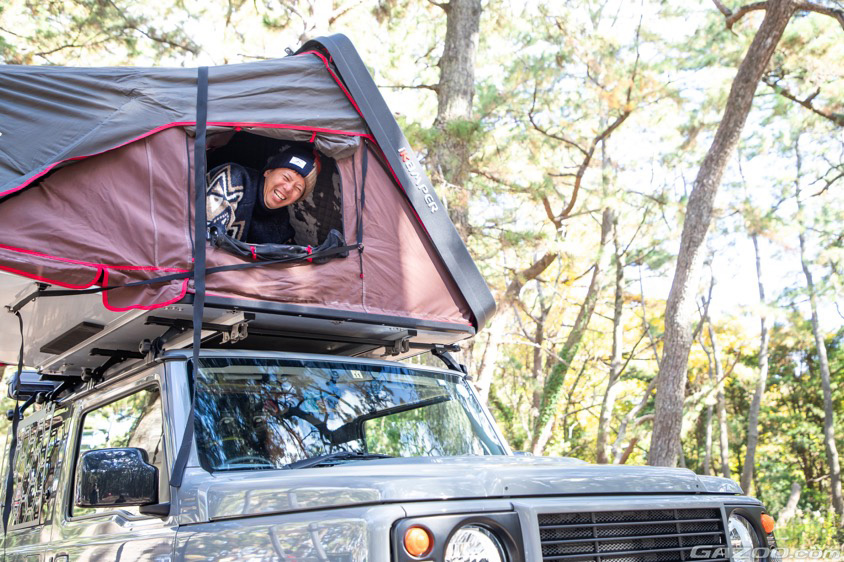 まず説明してくれたのが、愛車のアイキャッチとなっているiKaMPERのSkycamp mini2.0というルーフテント。慣れた手つきで設営すること5分程度で、あっという間にテントが完成した。