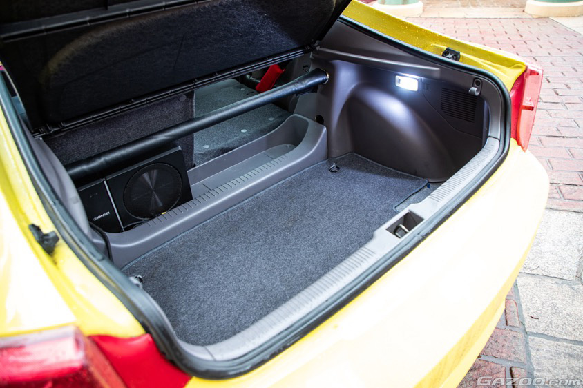 シルバーからホワイトに塗装したという純正ホイールも、ボディカラーとマッチしていてカッコイイ。内装についてもシフトレバー付近に黄色のステッチを追加したり、メーターパネルをカーボン調にカスタムしたりと、自分好みに仕上げていっているそうだ。
