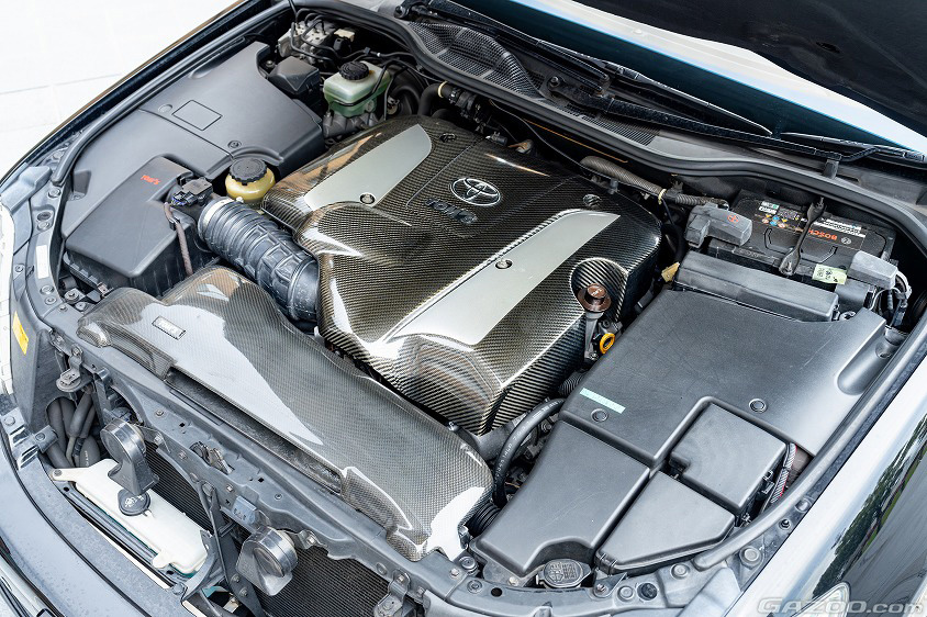 搭載されるエンジンはV型8気筒、4.3リッターの3UZ-FE。スタンダードなセルシオと同様ながら、スーパーチャージャーを組み合わせることで出力はノーマルの280psから354psにまでアップ。最大トルクも43.8kgmから57.0kgmまで高められ、街中での扱いやすさと高速でのハイパフォーマンスが両立されている。エンジンカバーもノーマルでは黒いABS製だったのに対し、V430-Rではスーパーチャージャーに合わせた専用形状に変更したカーボン製へと置き換えられ、さらにトムスのロゴも加えられている。これだけでも十分に魅力的な仕様と言えるだろう。