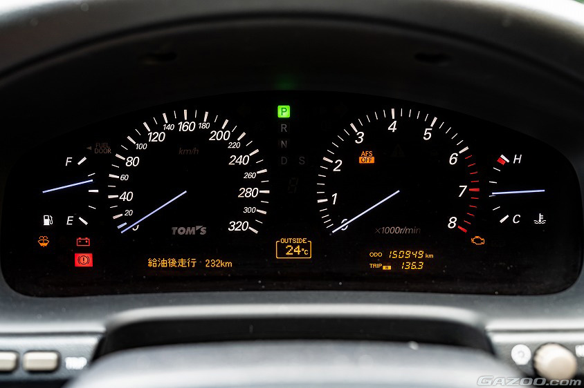 トムスチューンのパフォーマンスを示すポイントと言えるのが、トムスのロゴとともに320km/hまで刻まれたフルスケールメーター。さすがにこのメーターを使い切ることはないものの、運転席に座った際のビジュアル的満足感は圧倒的なのだ。