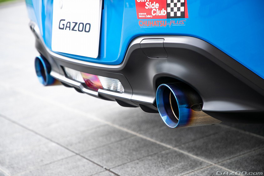 「僕は青が好きなので、基本はこのボディカラーに合うパーツを追加するようにしています。まず外装ですが、フロントのトムス製のスポイラーは当時一番かっこいいと思い、納車時にオプションで追加してもらったものです。ルーフはアンテナを替える時にブラックカーボン調にラッピングしてもらいました。そして、マフラーはガナドール製で、この焼き色が一番青かったので選んだんですよ」