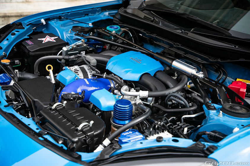 また『青を挿し色にしたい』と、ブルーのカーボンパネルやシフトノブなど、NORIさんのこだわりが光る内装も見逃せない。そしてそのこだわりはエンジンルームにも活かされている。