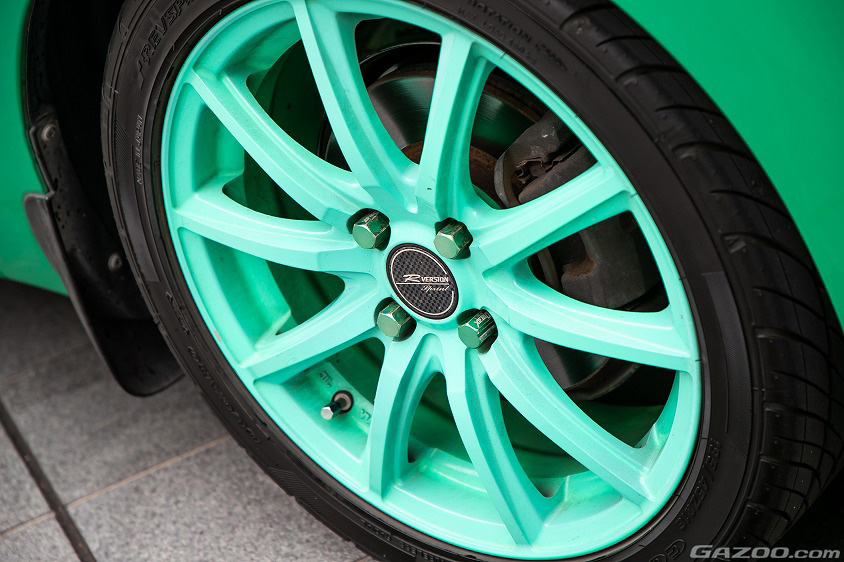 「ホイールを交換するなら緑色って決めていました。これは2年前にネットオークションで、ホイール屋さんが練習で塗ったものを安く出品していたものを、偶然見つけたので即購入しました。純正は14インチなのですが、コレは16インチなのでインチアップですね。けど、実は乗り心地を犠牲にしてでも17インチにしたいと思っていたので、次のホイールはすでに業者さんに塗装の見積もりを出してもらっているんです」