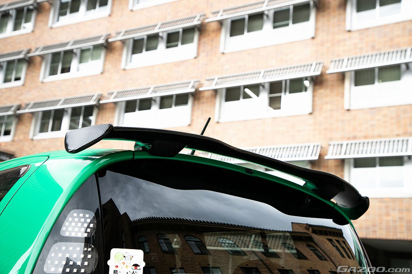 「緑の部分以外はカーボン調で揃えようと思って、フロントリップやサイドのカナードもフリマアプリで見つけて、自分で取り付けました。そして、リヤウイングは主治医のショップさんにて、ネジ穴を開けてもらって装着! ウイングってカッコ良いですよね。セラやニュービートルなど今まで乗ってきたクルマにも、極力ウイングを装着していました。灯火類はLED化していて、フロントの4連ライトはイカリング仕様です」