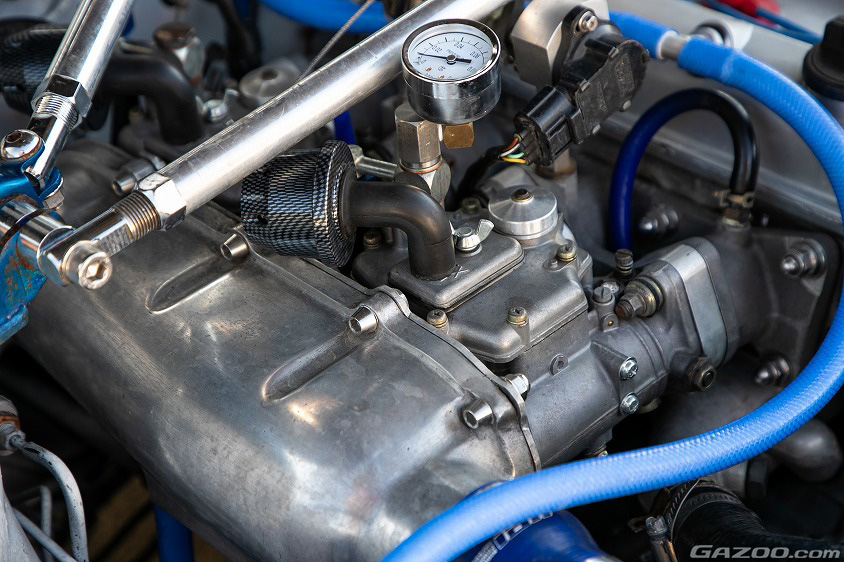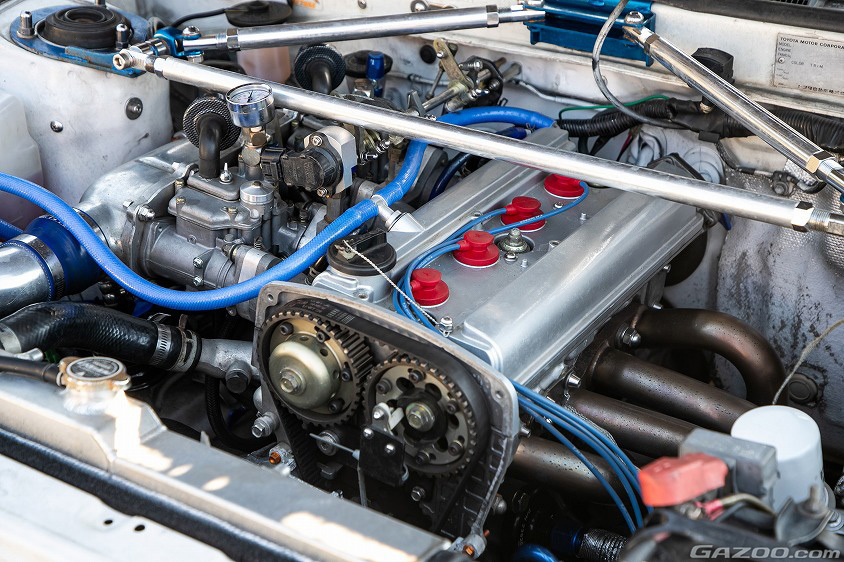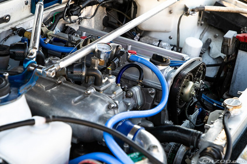ちなみに、現在の愛車に搭載されているエンジンは、グループA仕様のAE101用5バルブ4A-G。点火系は調整範囲の広さから電子制御式となっているが、吸気系統はあえてアナログで、フォーミュラトヨタ用のインテークマニホールドを介して装着されたキャブレターは“ウエーバー製よりもフィーリングが好き”という理由からソレックス製の44φを選んでいる。