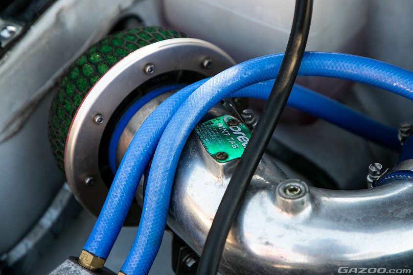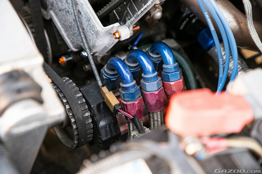 「よくドライサンプのメリットとして“低重心化”を挙げる方が多いようですが、僕としては常に十分なオイル流量が確保できることや、ポンプの余力の大きさがもたらす耐久性の向上といった点の方に効果があると思います。その他、エキゾーストマニホールドは4-2-1。パワーを求める上では4-1の方が優れているという意見もありますが、色々試したけど歴然とした違いは感じられませんでした。それなら、よりスムースで乗り易い4-2-1の方が良いかなと。排気量は1587ccのままだし、街乗り用にセッティングはあえて控えめに絞っているのでスペックは190psくらい。無理して最高回転数付近でパワーを出しても、そんなエンジンは街中では使えませんからね。もちろん、ブローバイガスはクリーナーに戻しているし、オイルミストの回収用タンクを付けているので車検もこのまま通るんですよ」