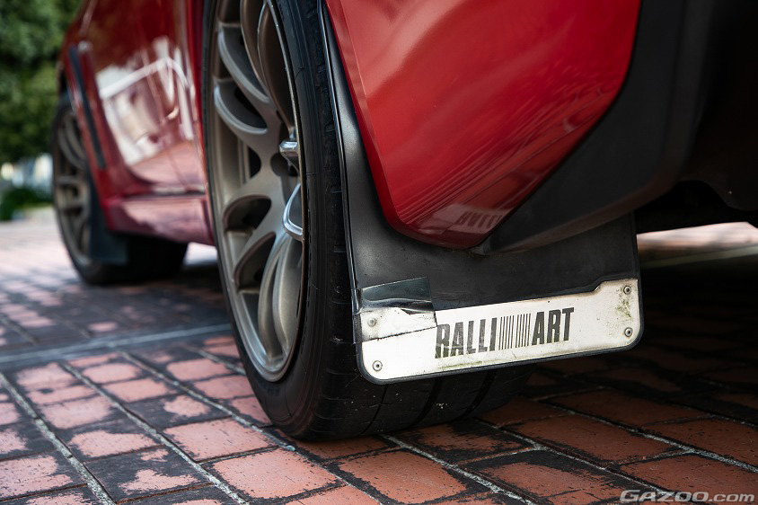 「スタイル的なお気に入りのポイントですか? やっぱりフロント周りですかね。ボンネットのエアダクトも、いかにもターボ!って雰囲気があって、私は好きです。それから、隠れた自慢のポイントがラリーアートのマッドフラップ。これは既に絶版品なんですヨ」