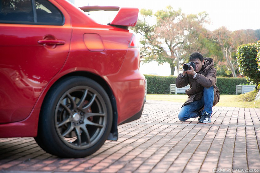 いくら話しても話し切れないほどのランエボ愛に溢れたまっつんさん。取材の合間も2台のミラーレス一眼カメラを巧みに使い分けながら、様々な角度から愛車の写真をパシャパシャ。撮影用に『LANCER EVOLUTION-Ⅹ』のロゴが描かれた化粧プレートを自前で作った他、スチールカメラのみならず、エボ好きが高じてドローンでの動画も手掛けるようになったという。