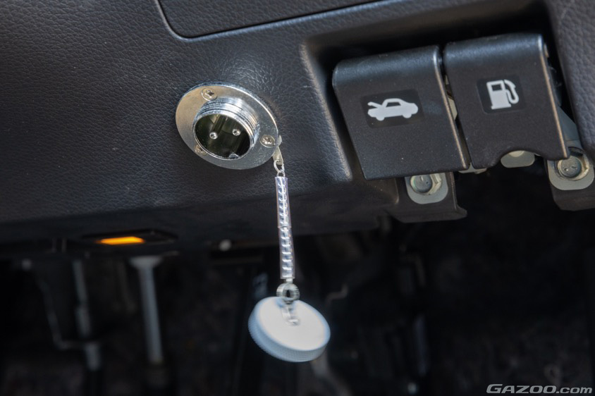 ほかのお気に入りポイントも尋ねると、ハンドル右側に付いているメタルコンセントの形跡もということだ。これは、赤色灯やフラットビームといった電装品の電源用として装着されているコンセントで、端子を差し込んでネジで締めるのが特徴となっている。この機構だと、足を引っ掛けて抜けてしまうという事態を防ぐことができるそうで、これが付いているいるのは機動捜査用車の証のひとつなのだとか。