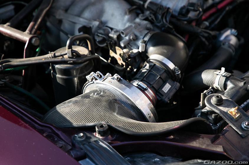 激安で手に入れたとはいうものの、エンジンまわりにはオートエクゼ製カーボンエアクリーナーやマキシム製エキマニなど豪華なパーツが装着されている。これらは前オーナーが手を加えたポイントなのだとか。