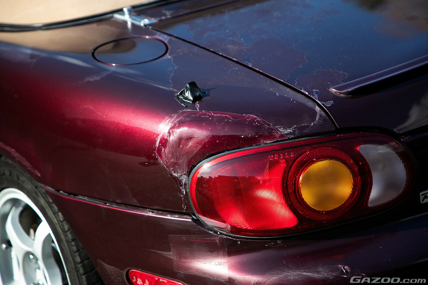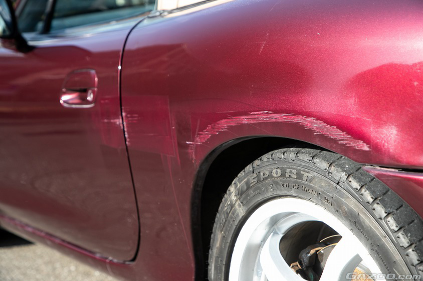 リヤクォーターパネルには大小様々なキズが残されているが、こちらは競技ではなく不注意でぶつけてしまったキズとのこと。ジムカーナに出場する際にレギュレーション上、形を整えなければならなかったため、急遽内側から叩いて修復した状態だが、今後はしっかりと直して、元どおりのキレイな車体に復活させる予定だという。