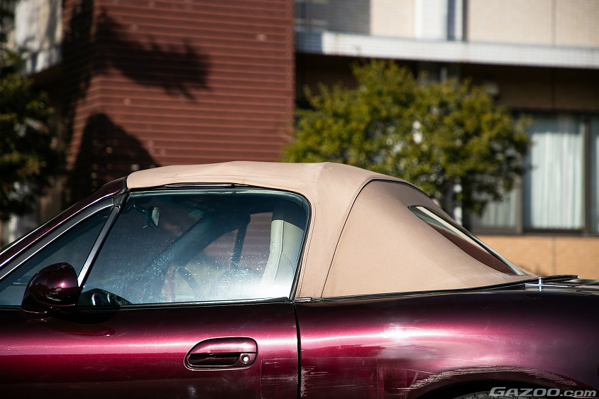 アールヴァンレッドマイカのボディカラーと、ソフトベージュの幌(前オーナーによってビニール製からファブリックに張り替え済み)という組み合わせは上品な印象を与え、幌を閉めた状態ではモータースポーツで使われるクルマには見えない。