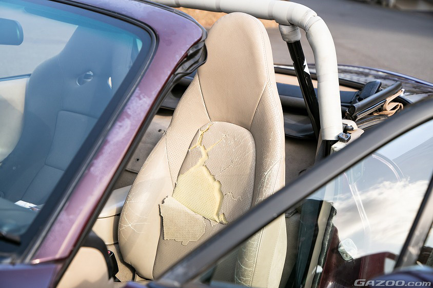 乗り始めて約2年が経過し、その時間分だけ自分でメンテナンスを行なうことで整備技術も向上しているという okuboさん。そのため機関系は好調をキープしているが、経年による所々にヤレが発生しているのは気になるところ。特に助手席はシートレザーが破れてしまい、中のウレタンが露出している状態。