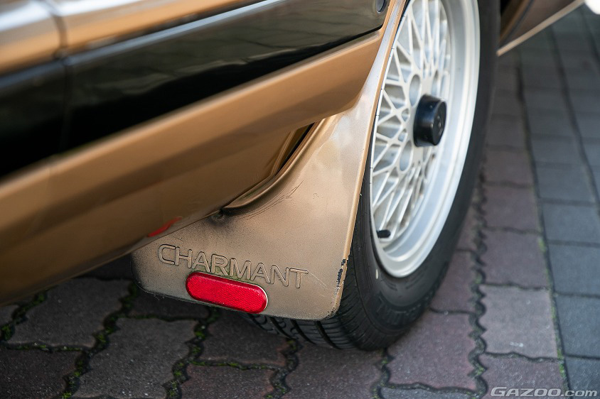 フロントマスクに個性を与えるフォグランプもディーラーオプションだそうだ。特徴的なメッシュデザインを採用したホイールは、当時のディーラーオプションだった純正ホイール。タイヤの泥よけは標準装備だったもので、『CHARMANT』のロゴが入っているところが可愛らしい。テールランプもE70カローラとは異なるデザインで、外板パネルと同様、入手が困難なパーツのひとつという。